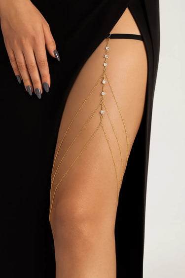 Bu altın rengi bacak aksesuarı, ince zincirlerin zarifçe birleştiği modern ve büyüleyici bir tasarıma sahip. Işığı her hareketinizle yakalayan taş detayları, görünümünüze hem şıklık hem de büyüleyici bir gizem katıyor.