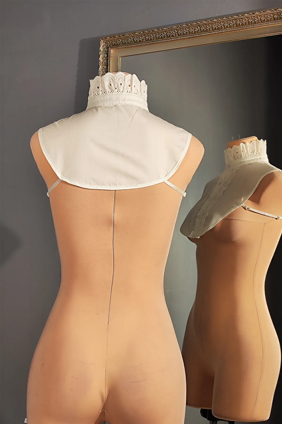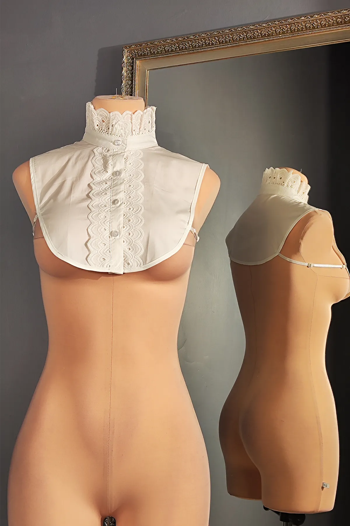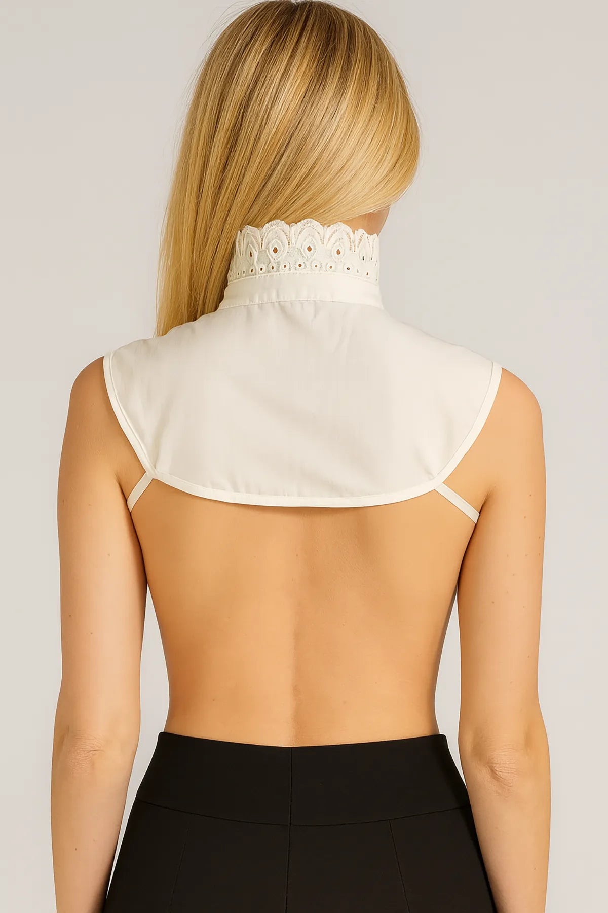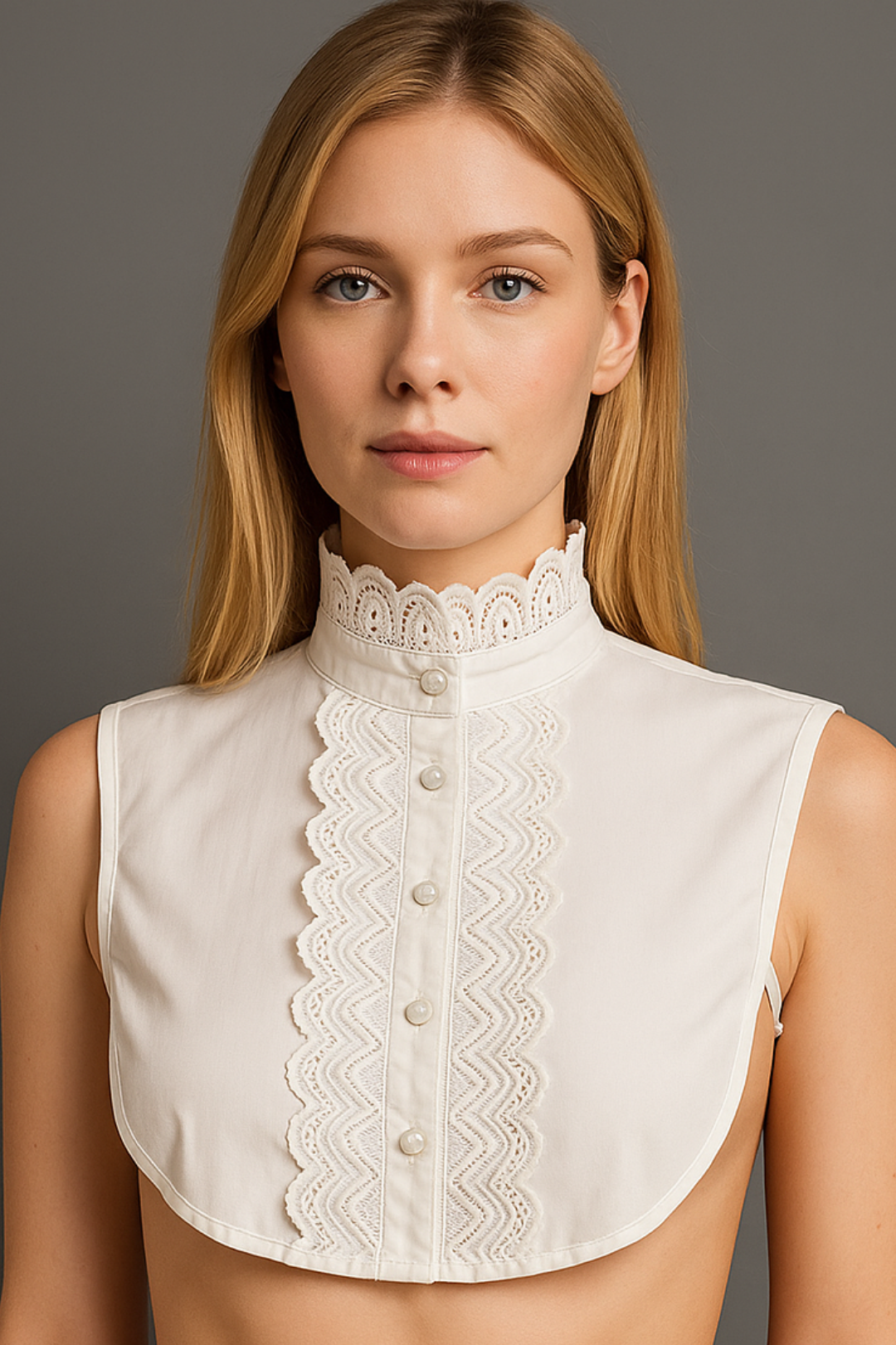 Kazak, triko ya da elbise giymeyi seviyor ama içine gömlek giyme derdiyle uğraşmak istemiyorsan, bu sahte yaka tam senlik. Yüksek, fistolu dantel yakası boynu zarifçe sarıyor ve sanki baştan aşağı dantelli bir gömlek giymişsin gibi şık bir etki veriyor.