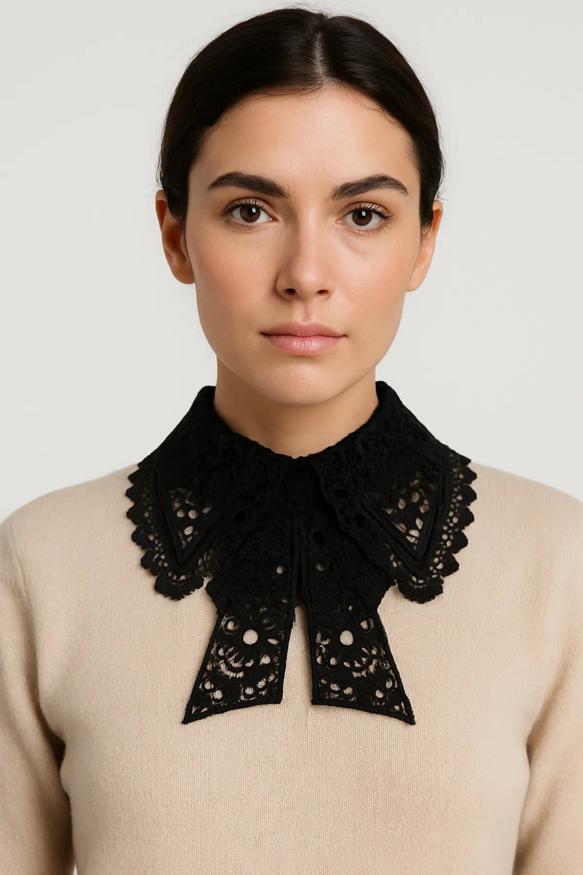 Kıyafete tek dokunuşla karakter kazandıran parçalar vardır — işte bu çıkarılabilir dantel yaka tam olarak o etkiye sahip. İnce oyma dantel yapısı, gotik-romantik tarzı modern bir şıklıkla buluştururken, uzun fiyonk detayı görünümü daha da zarif hale getiriyor. Elbiseler, basic bluzlar, triko kazaklar ve hatta ceketlerle kombinlenebilen çok yönlü bir aksesuar.
