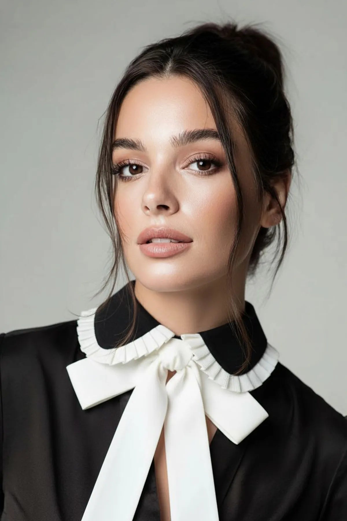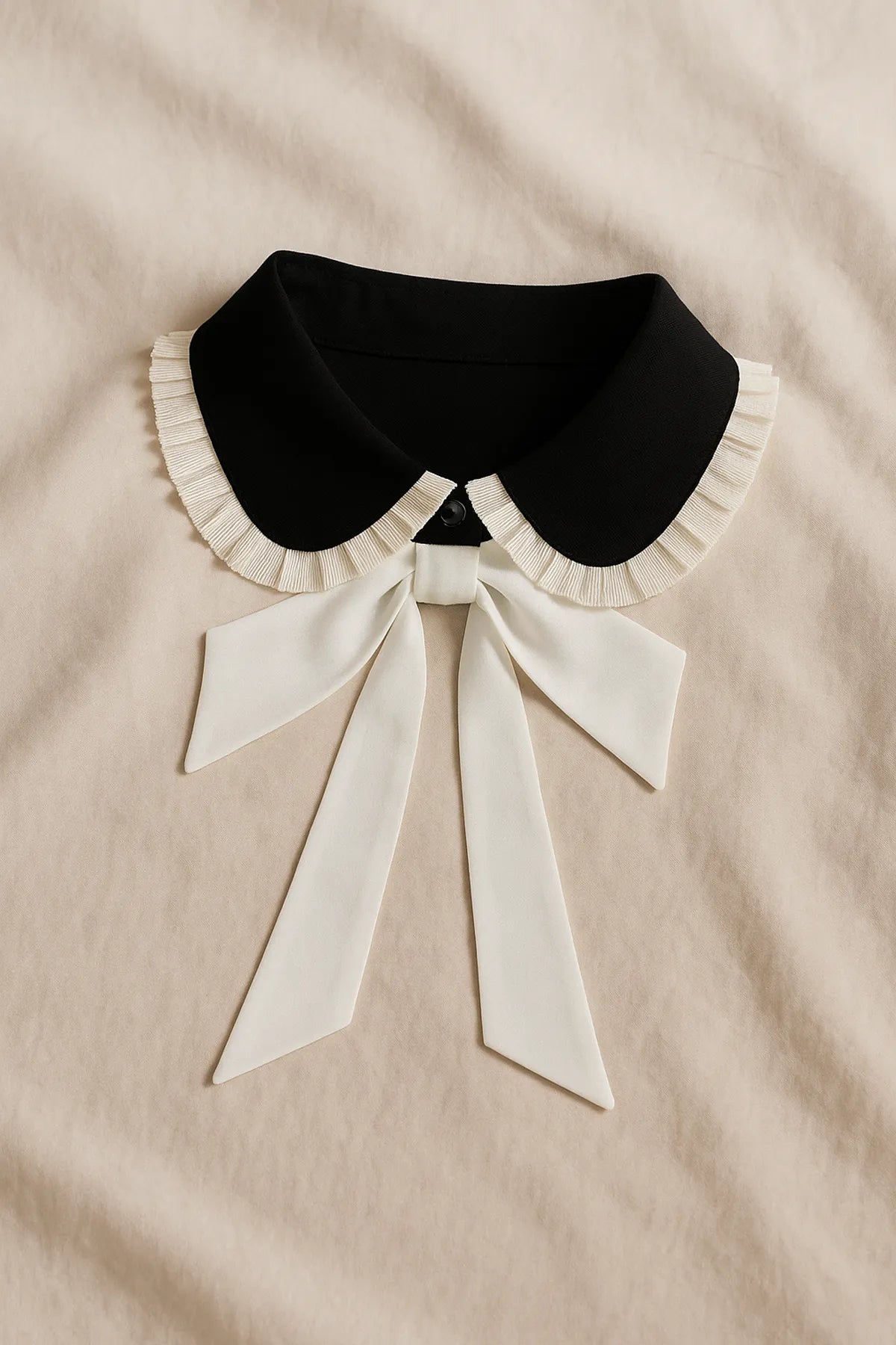 Zarif, masalsı ve Fransız esintili bu siyah-beyaz yaka; iki renkli çarpıcı kontrastı, ince pile-fırfırlı kenar süslemesi ve önde uzayan şık kurdele detaylarıyla her kombine romantik bir görkem katıyor.
