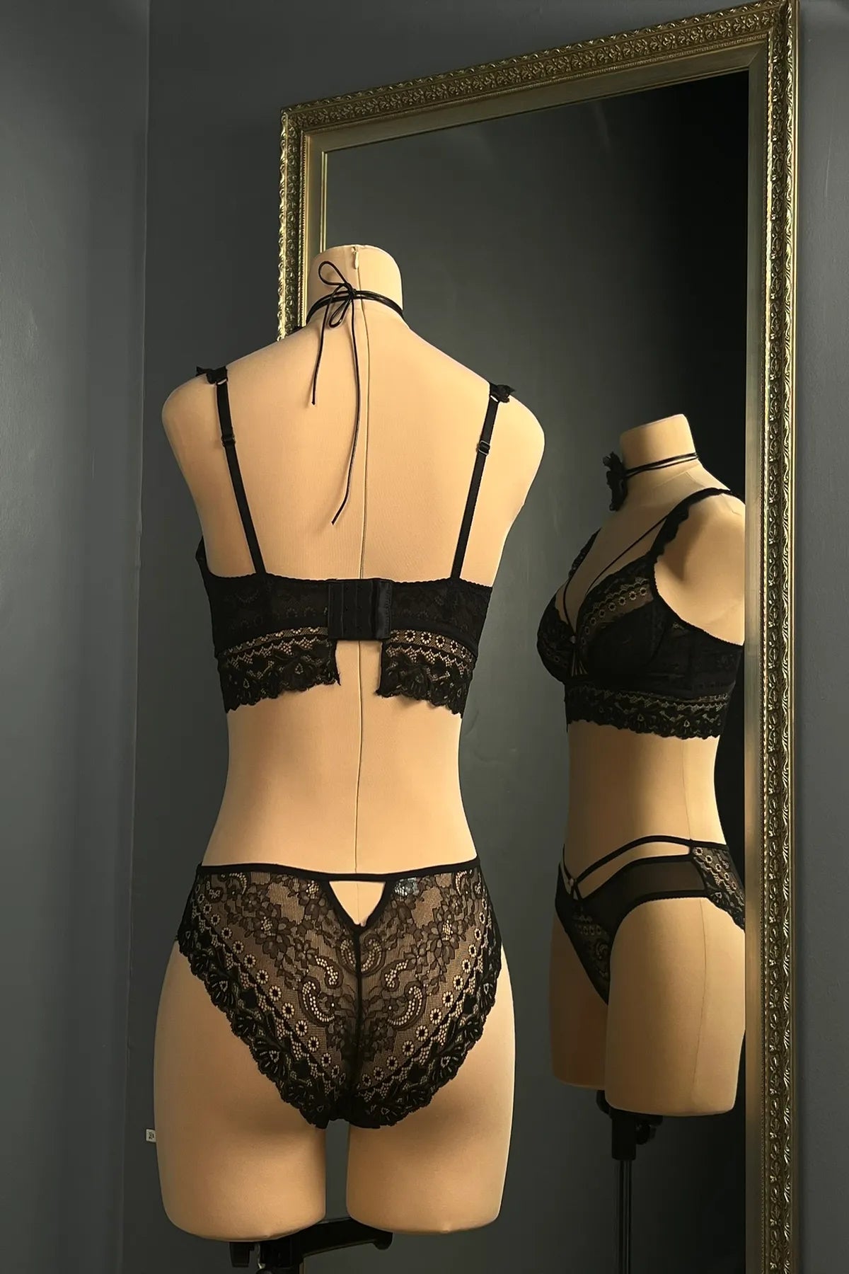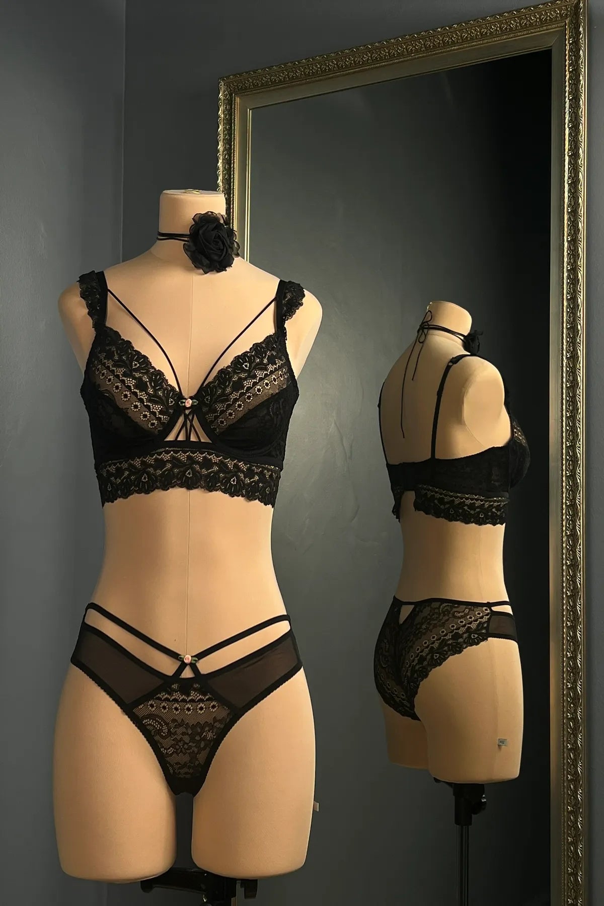 Midnight Whispers – İp detaylı siyah dantelli iki parçalı takım, vücuda zarifçe oturur.