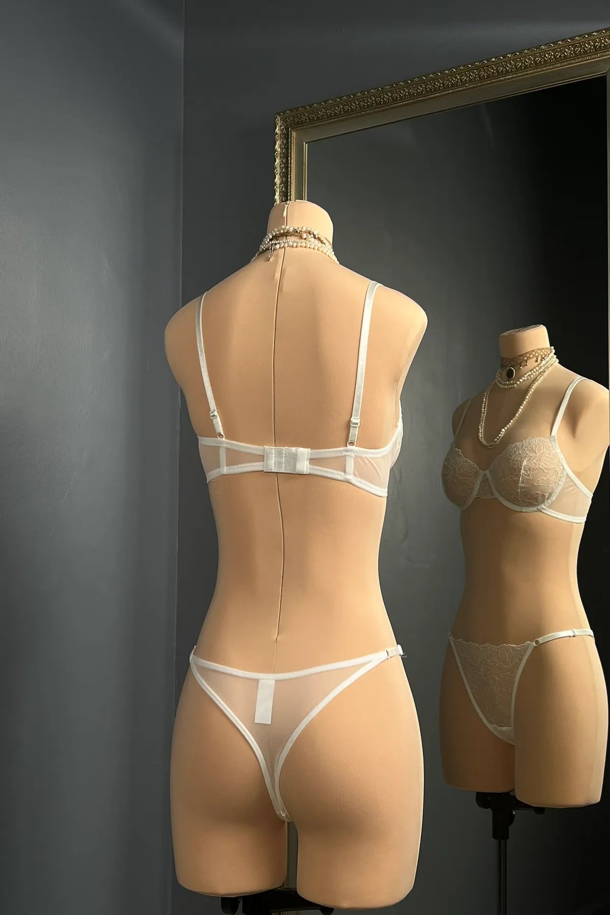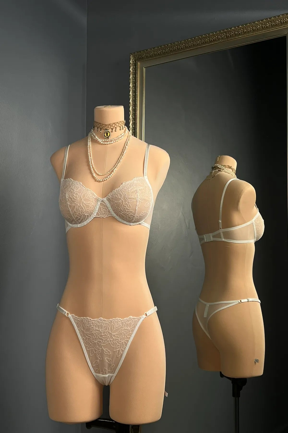 Beyazın temiz ve zamansız duruşunu ince floral işlemelerle birleştiren bu set, hem sade hem büyüleyici bir estetik sunar. Hafif transparan dokusu ve modern çizgileriyle taze, şık ve çarpıcı bir silüet oluşturur.