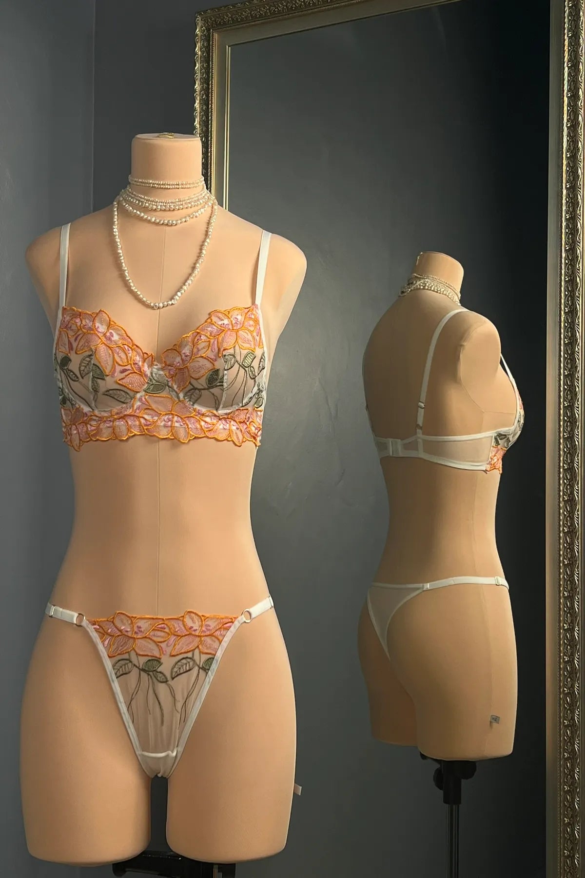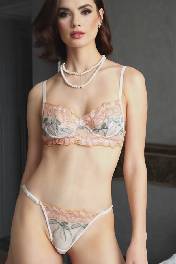 Bu takım, ilkbaharın taze enerjisini krem tonunun zarafetiyle buluşturuyor. Turuncu çiçek işlemeleri, sanki güneş ışığı dantelin üzerine düşmüş gibi parlıyor—hem sıcak hem de yumuşak bir etki yaratıyor.
