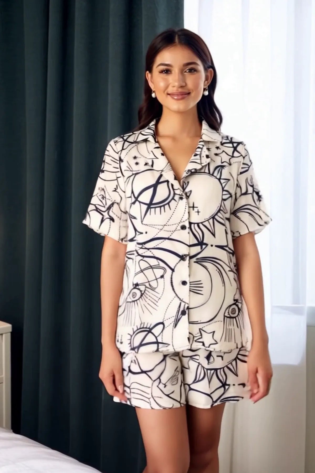 Ekru zemin üzerindeki lacivert güneş baskısıyla öne çıkan, önden düğmeli gömlek tipi üst ve şorttan oluşan zarif bir pijama takımı.