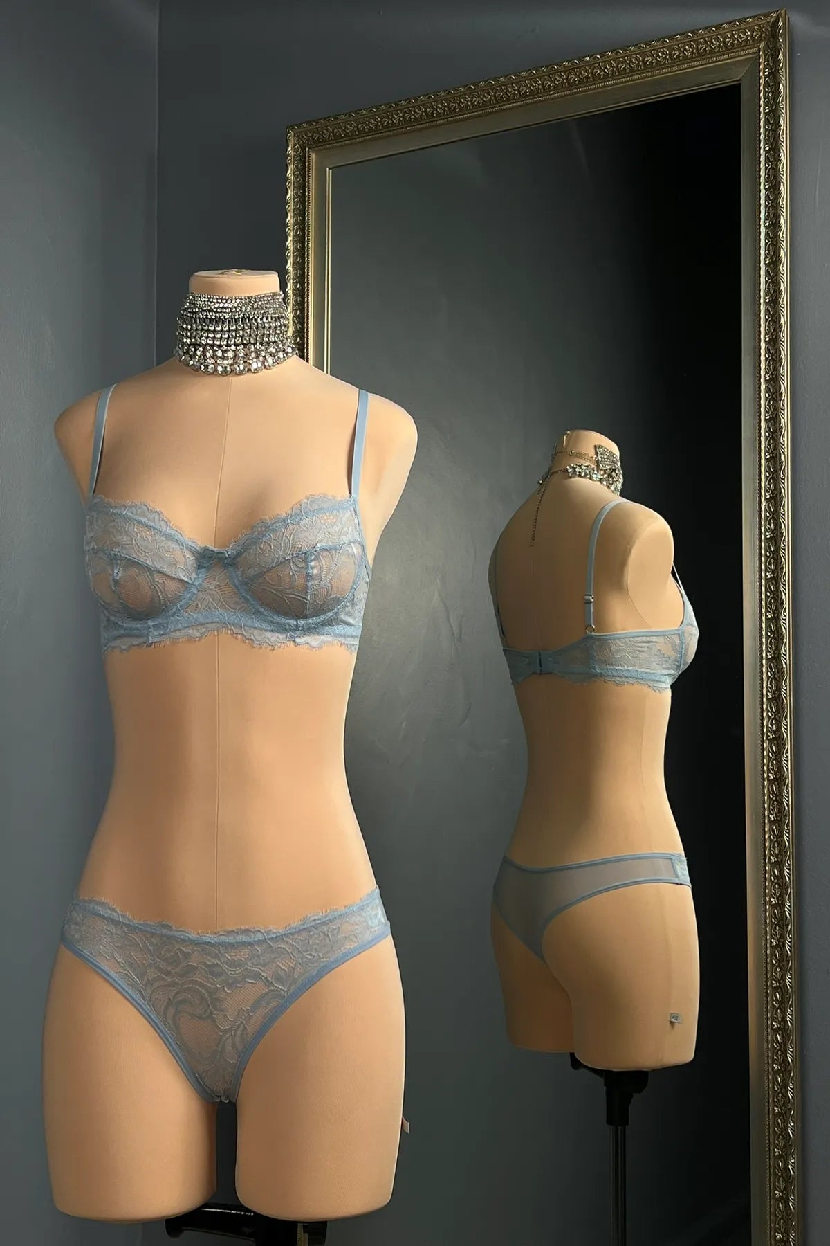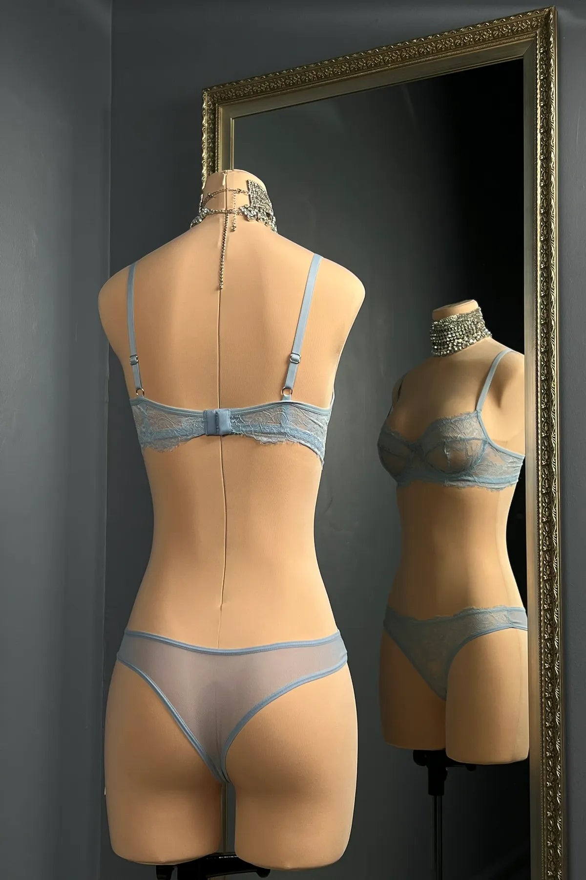 Buz mavisinin sakin ve ferah tonunu ince dantel dokularıyla bir araya getiren bu set, hem şık hem de zarif bir görünüm sunar. Transparan tül ile dantelin birleşimi, tasarıma hafiflik ve romantik bir etki kazandırırken modern kesimiyle de göz alıcı bir silüet oluşturur.