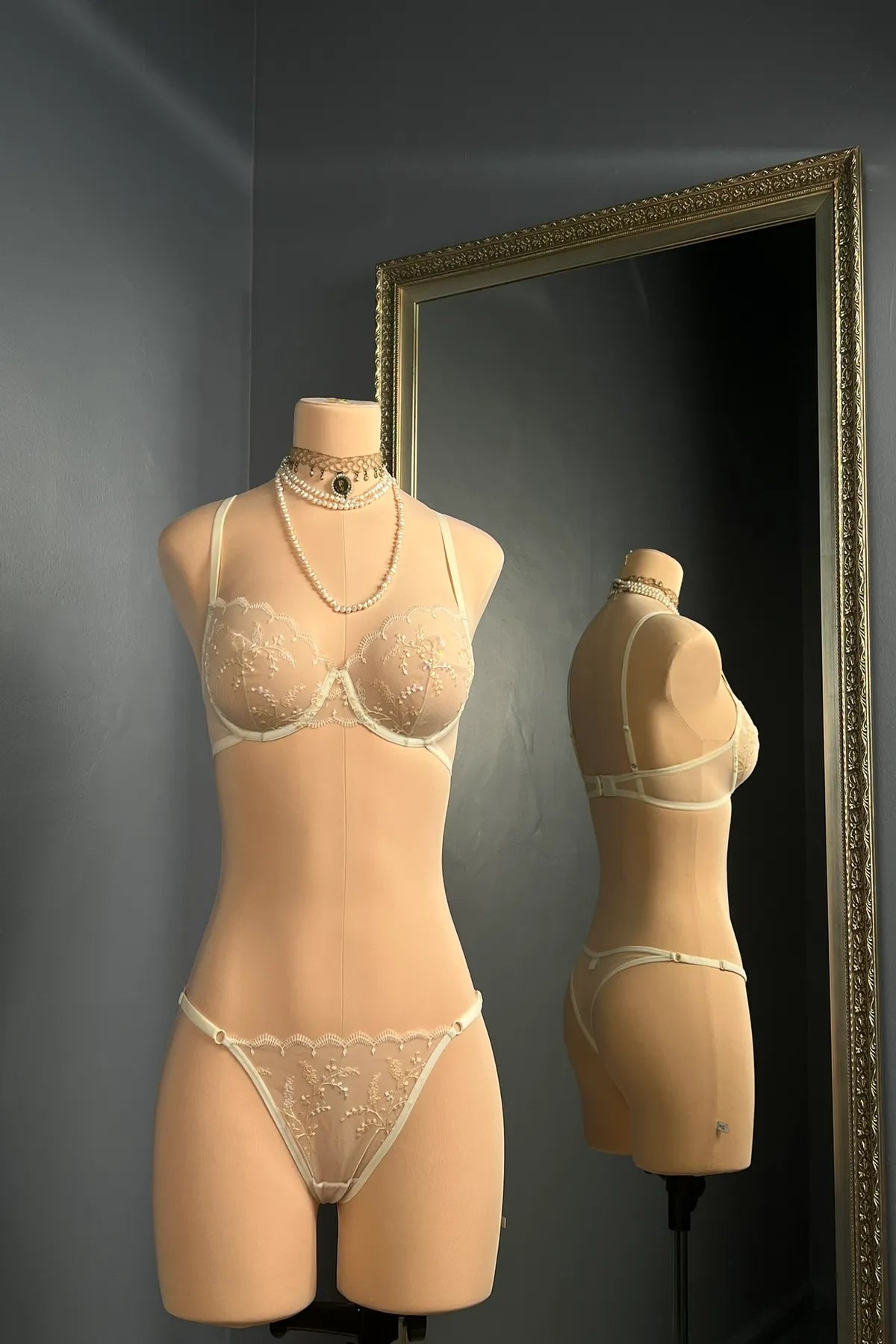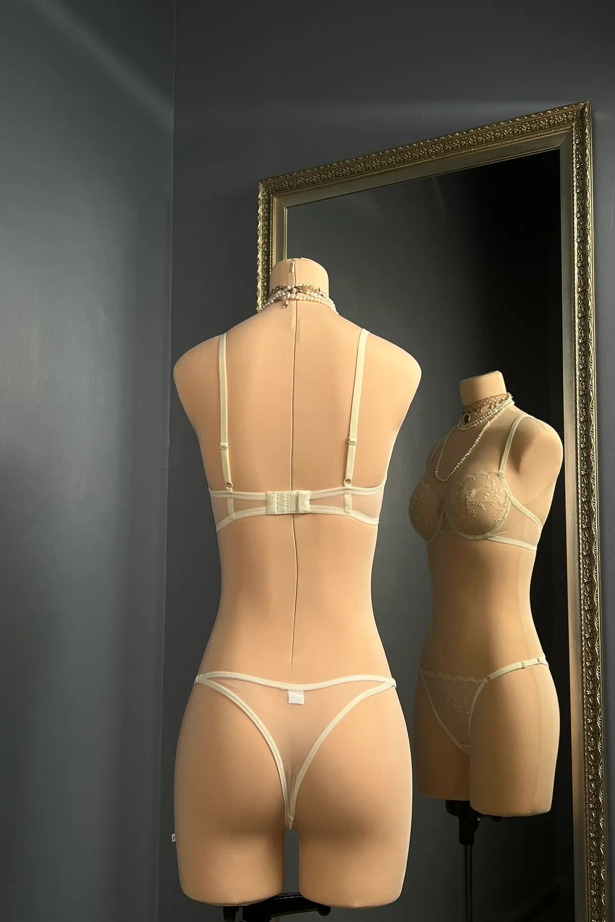 Krem tonunun saf ve yumuşak görünümünü ince işlemelerle birleştiren bu set, zarafetin en sade hâlini sunar. Hafif transparan dokusu ve narin çizgileriyle hem masum hem de çekici bir estetik oluşturur.