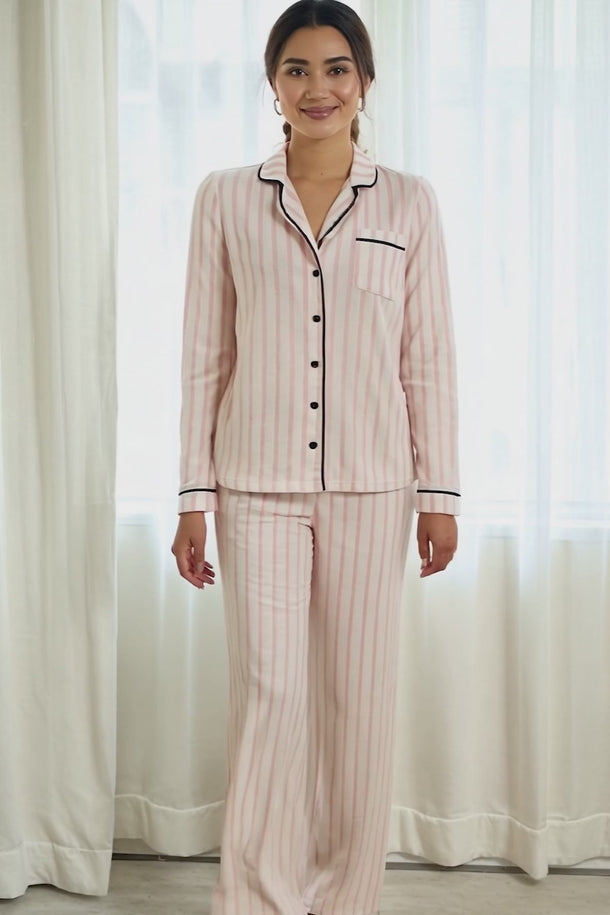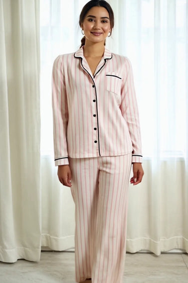 Pembe çizgili tasarımıyla zarif bir görünüm sunan, önden düğmeli gömlek tipi üst ve uzun alt parçadan oluşan pijama takımı.